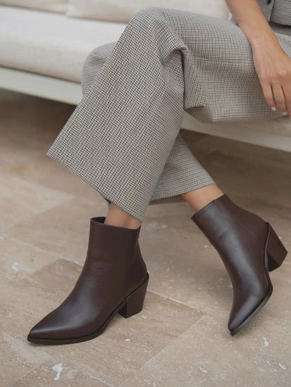 Botines elegantes en tono chocolate profundo, diseñados para elevar cualquier outfit con una silueta estilizada y moderna. Su punta fina y tacón bloque aportan presencia, estabilidad y un look sofisticado que combina perfecto con jeans, pantalón formal o falda. Un básico premium para lucir impecable todos los días.